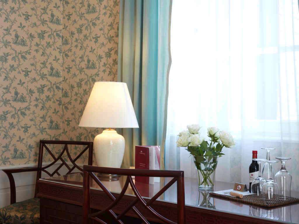 Das Teehauszimmer erinnert am stärksten an den unvergänglichen Zauber der im 18. Jahrhundert so beliebten Chinoiserien. Denn die Tapete von Colefax & Fowler ist eine Kopie eines Originals aus ebendieser Zeit. Das Teehauszimmer ist mit anmutig leichten, asiatisch-schwungvollen Möbeln aus Mahagoni ausgestattet.