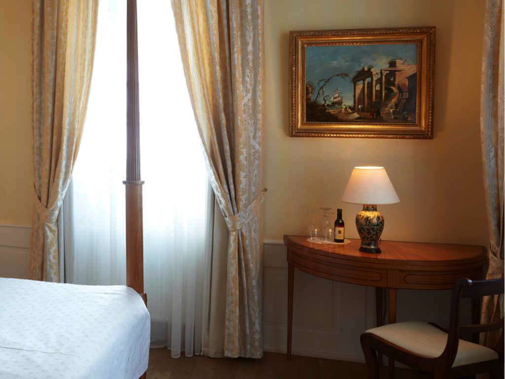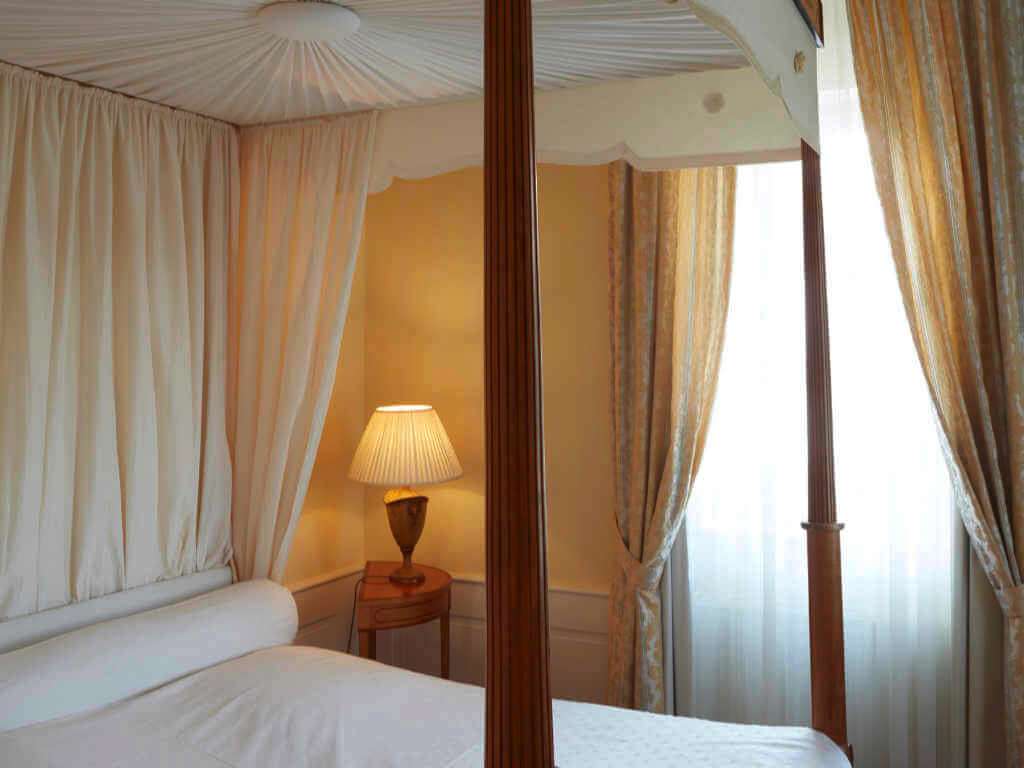 Our luxurious English Suite with its large four poster bed is particularly charming. The furniture was handmade of satinwood, a precious tropical timber, and is based on 18th century designs by famous English cabinet makers. The four poster bed is covered in silk and it does not only invite those newly in love to come for an unforgettable stay. You will find the same style in the bathroom, of course. Elegant luxury in golden, warm hues makes it a pleasure to take a bath.