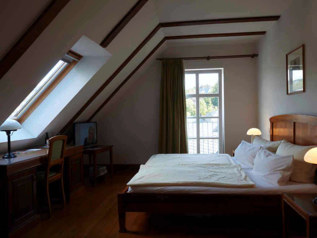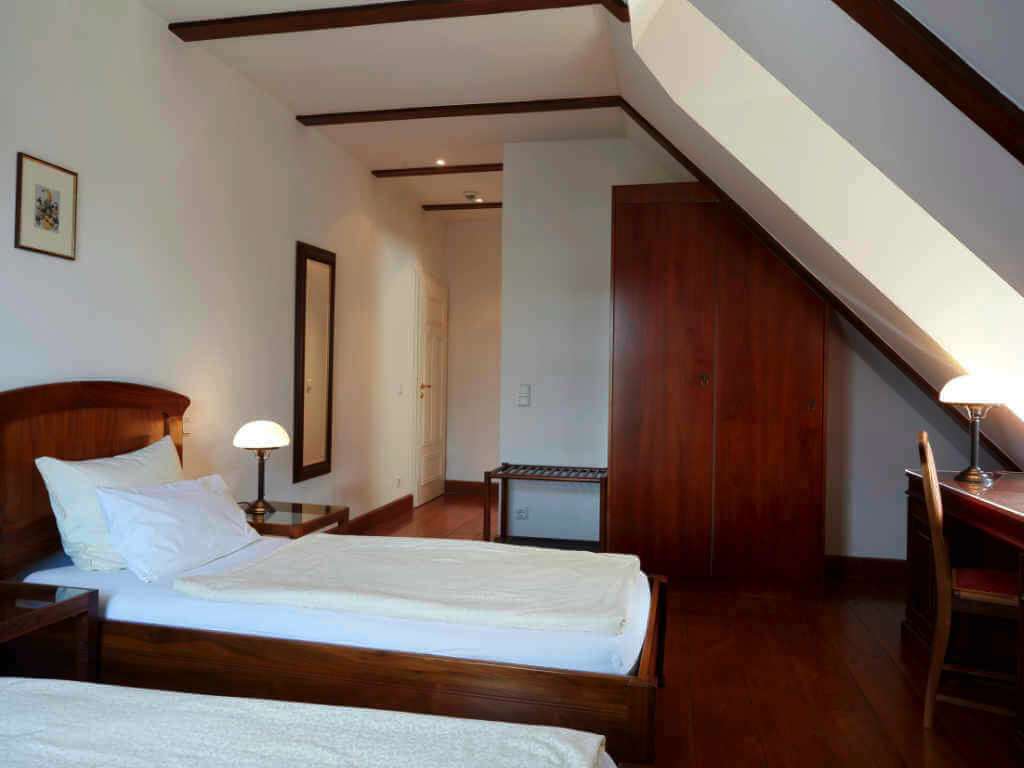 Sloping ceilings, old beams and wide oak floorboards characterize our charming attic rooms, of which the Wittgenstein-Room forms part. The atmosphere is enhanced by the use of elegant walnut furniture, richly coloured drapery and a bathroom that matches the elegance of the bedroom.